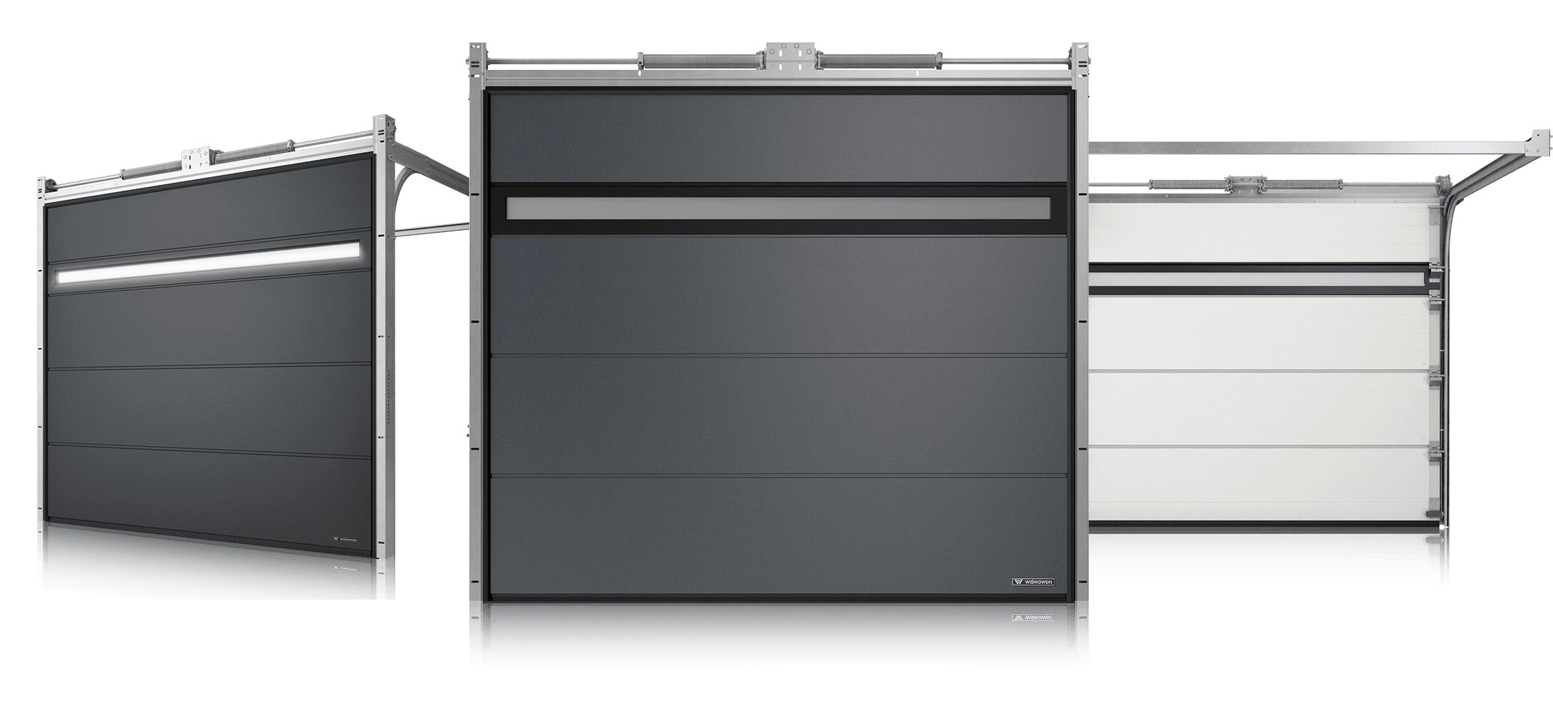 The WIŚNIOWSKI brand offers two types of panels: VISUAL and HORIZON. They are dedicated for the UniPro sectional garage doors with smooth panels without ribs or with low or high ribs.