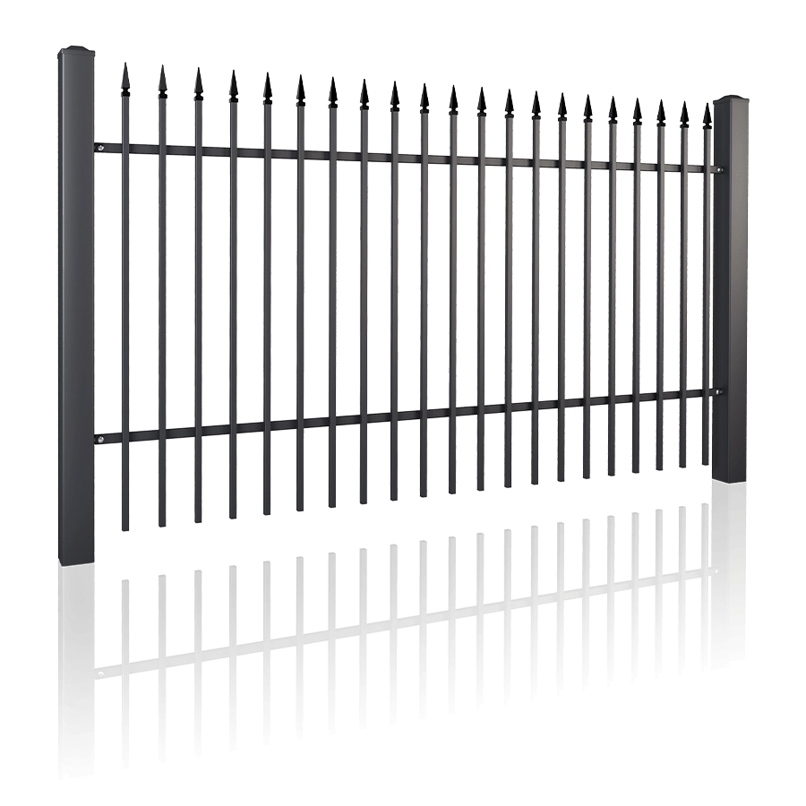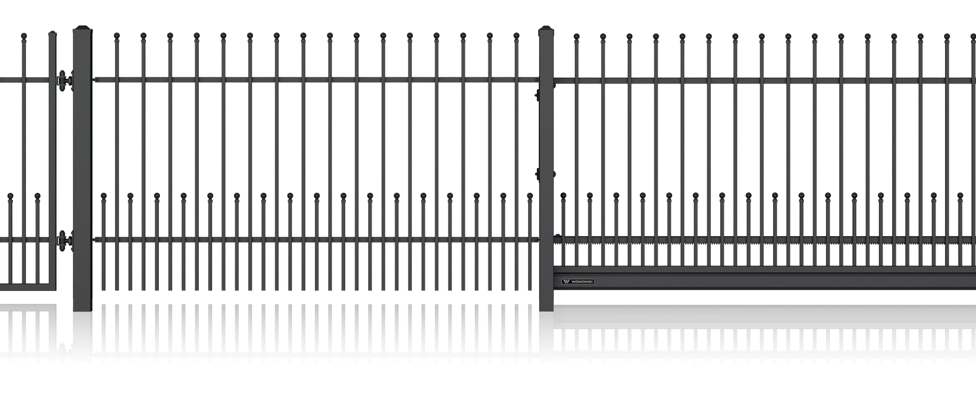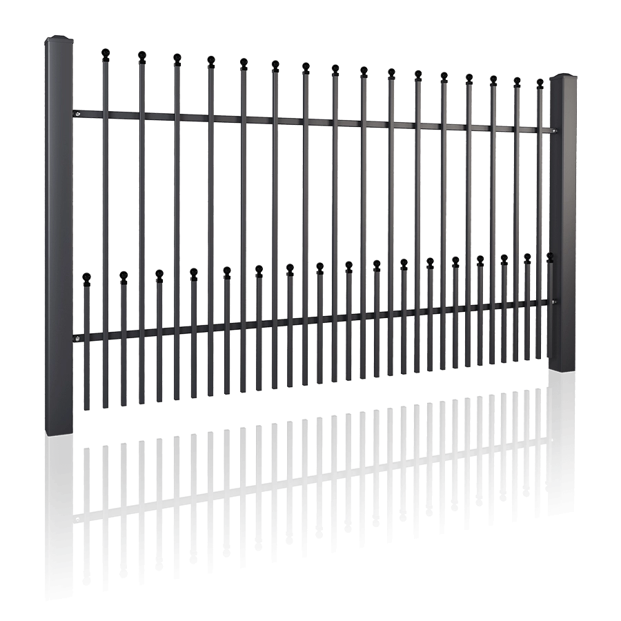 Four fence models in the VARIO collection, made of steel box sections, constitute a universal offer for everyone. The sections are terminated with PVC finial tips in the shape of a pyramid, sphere or cone. The top edge in each model can be straight, concave or convex. The VARIO segments are also available in a skewed version.