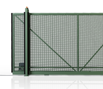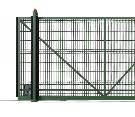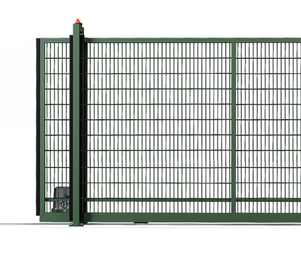 The WI gates with running wheels are part of a system of access control components. Together with industrial segments, mesh panels, posts, and wickets, they form a comprehensive fence solution.