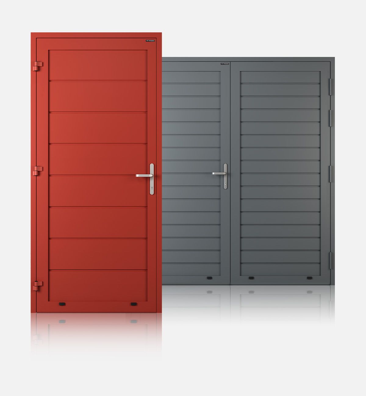You can choose a single- or double-leaf version. The leaf frame and opening frame were made of 45 mm deep single-chamber aluminium sections without a thermal break. The leaf was infilled with the AW77 or AW100 aluminium profile. Insulated with polyurethane foam. The inside of the door was additionally reinforced with sealing sheet. Perfect for unheated buildings.
